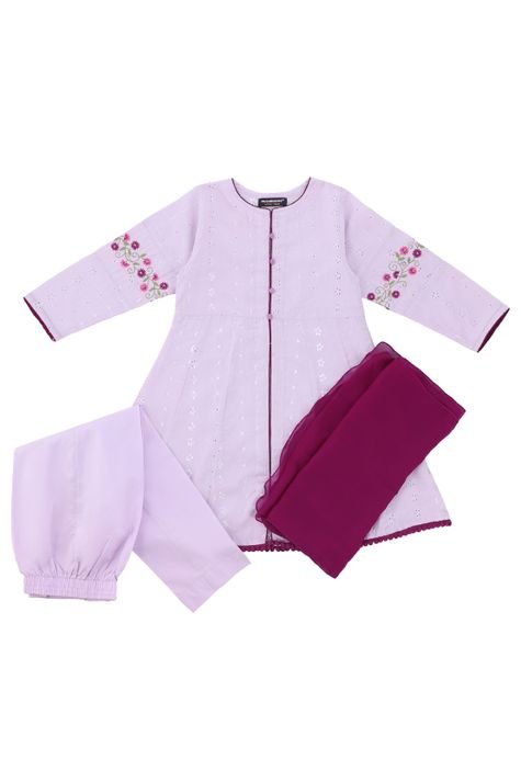 Lilac a-line frock has delicate embroidery on the sleeves. Lace,buttons and facings add to the details. this ensemble is paired with a contrast dupatta and cigarette pants.