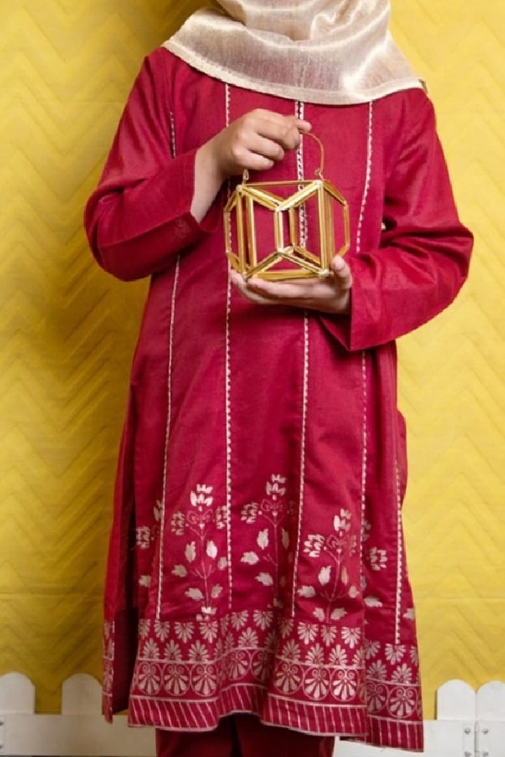 Maroon Kali Shirt has screen printed hemline inspired by greek motifs. Delicate gold lace brighten-up the whole outfit. This ensemble is paired with cigarette pant and chiffon dupatta making it perfect for seasonal festivites. Fabric: Karandi, Colour: Maroon